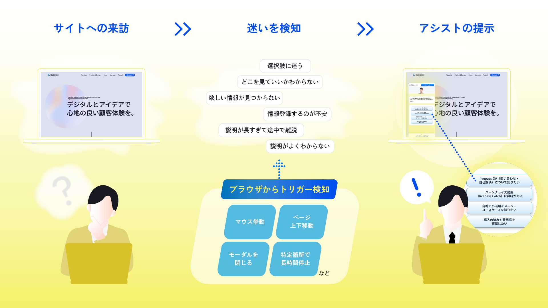 livepassは、この構造的な課題に着目し、ページを作り替え続けるのではなく、来訪者一人ひとりの状態を捉え、その場で最適な接点を提示するという発想へ転換することで、従来の改善コストに代わる新しい成果の出し方を開発しました。